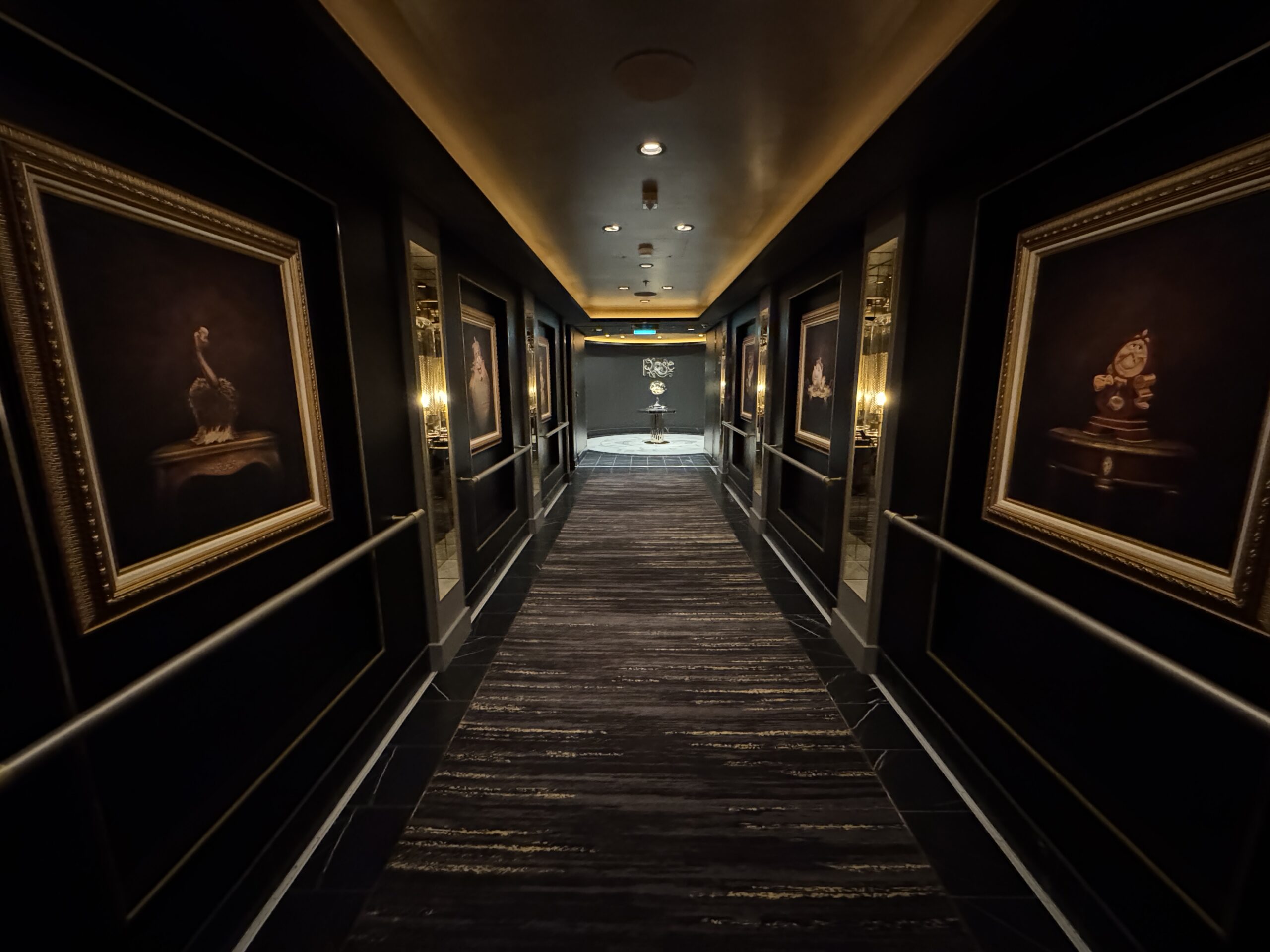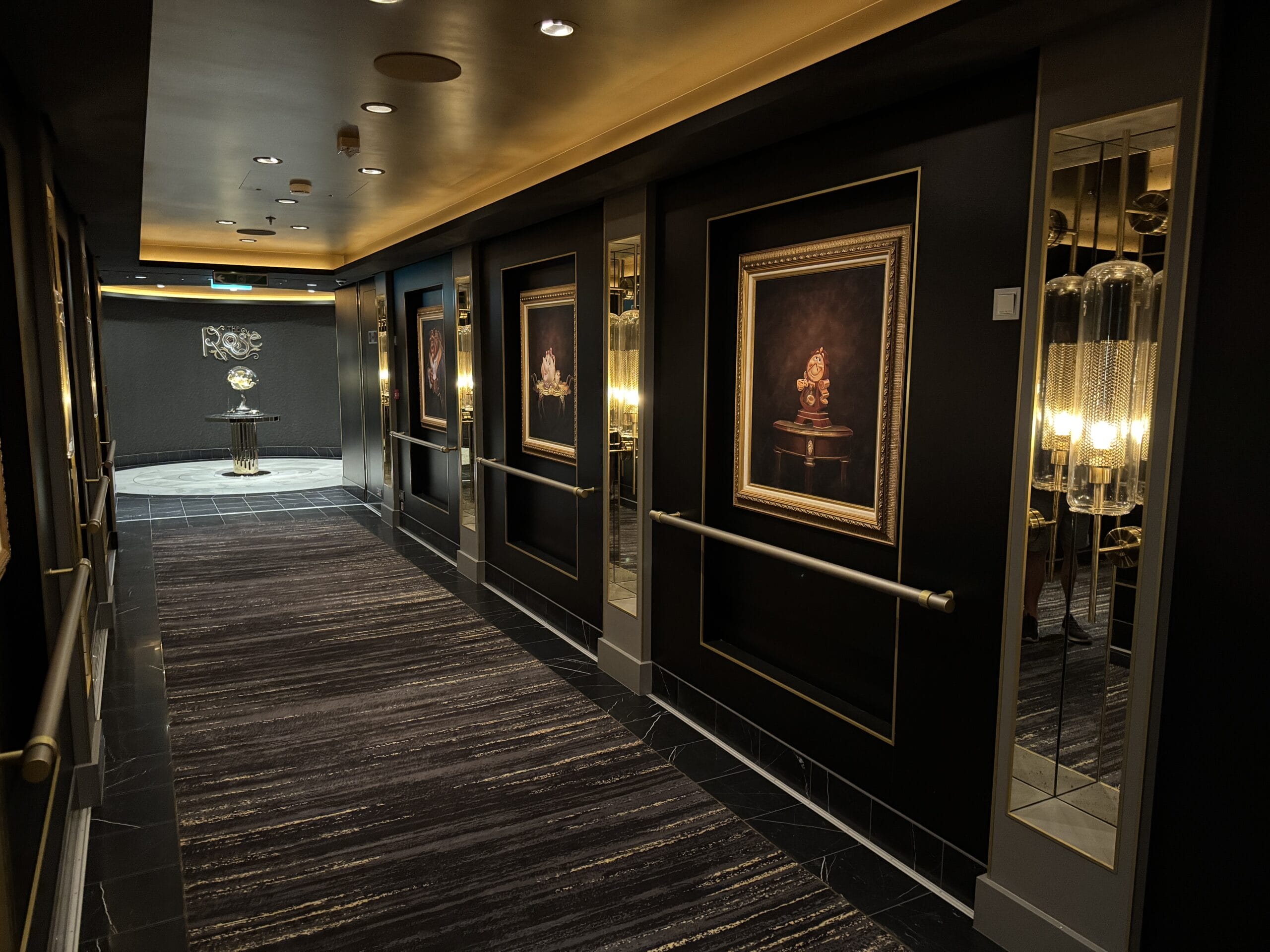 The hallway leading to The Rose looks bold and rich with dark walls a gold ceiling.