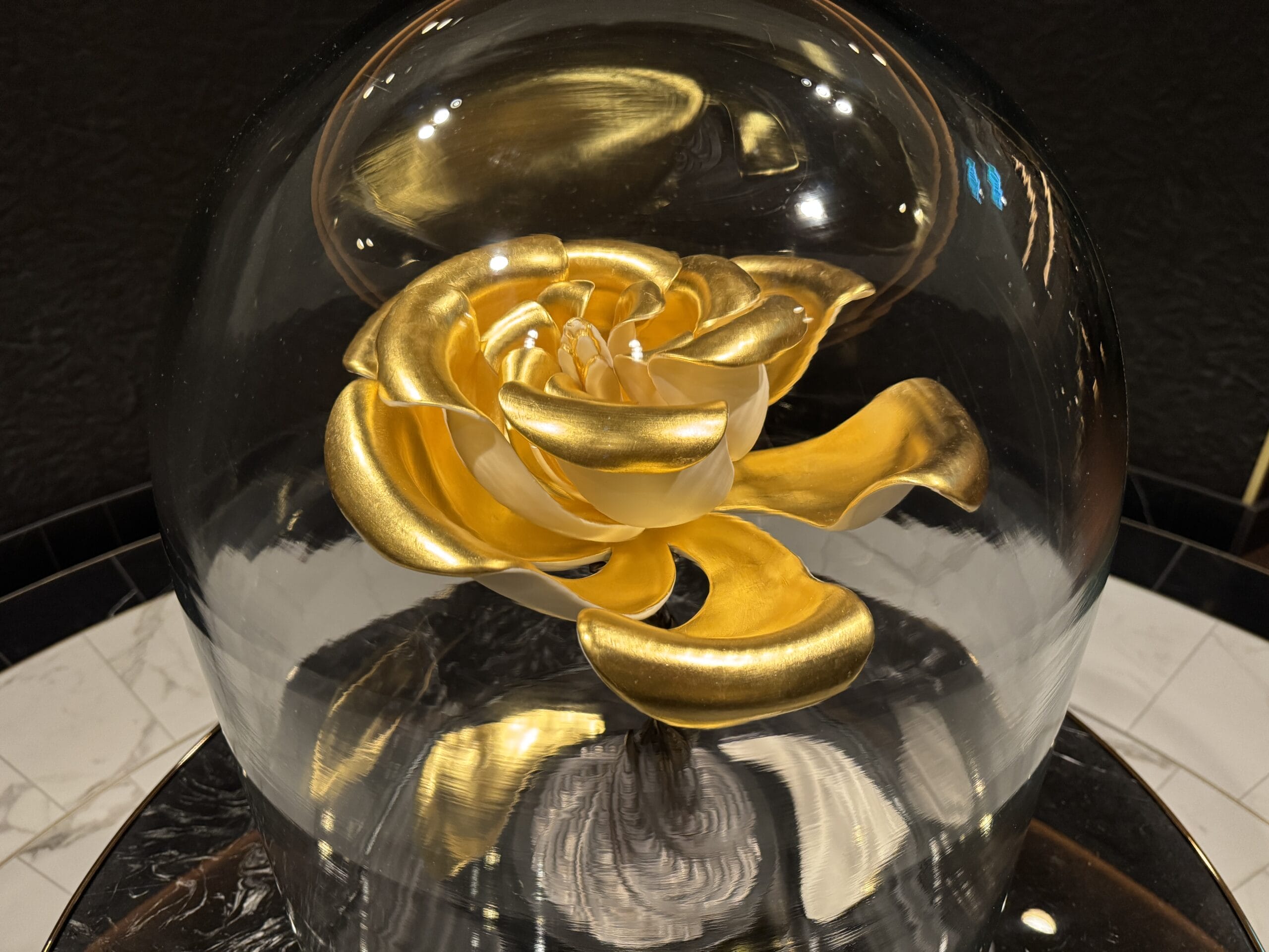 Gold ceiling decorations resemble the curves of rose petals. Gold panels on the walls feature an arabesque pattern including rose cutouts.