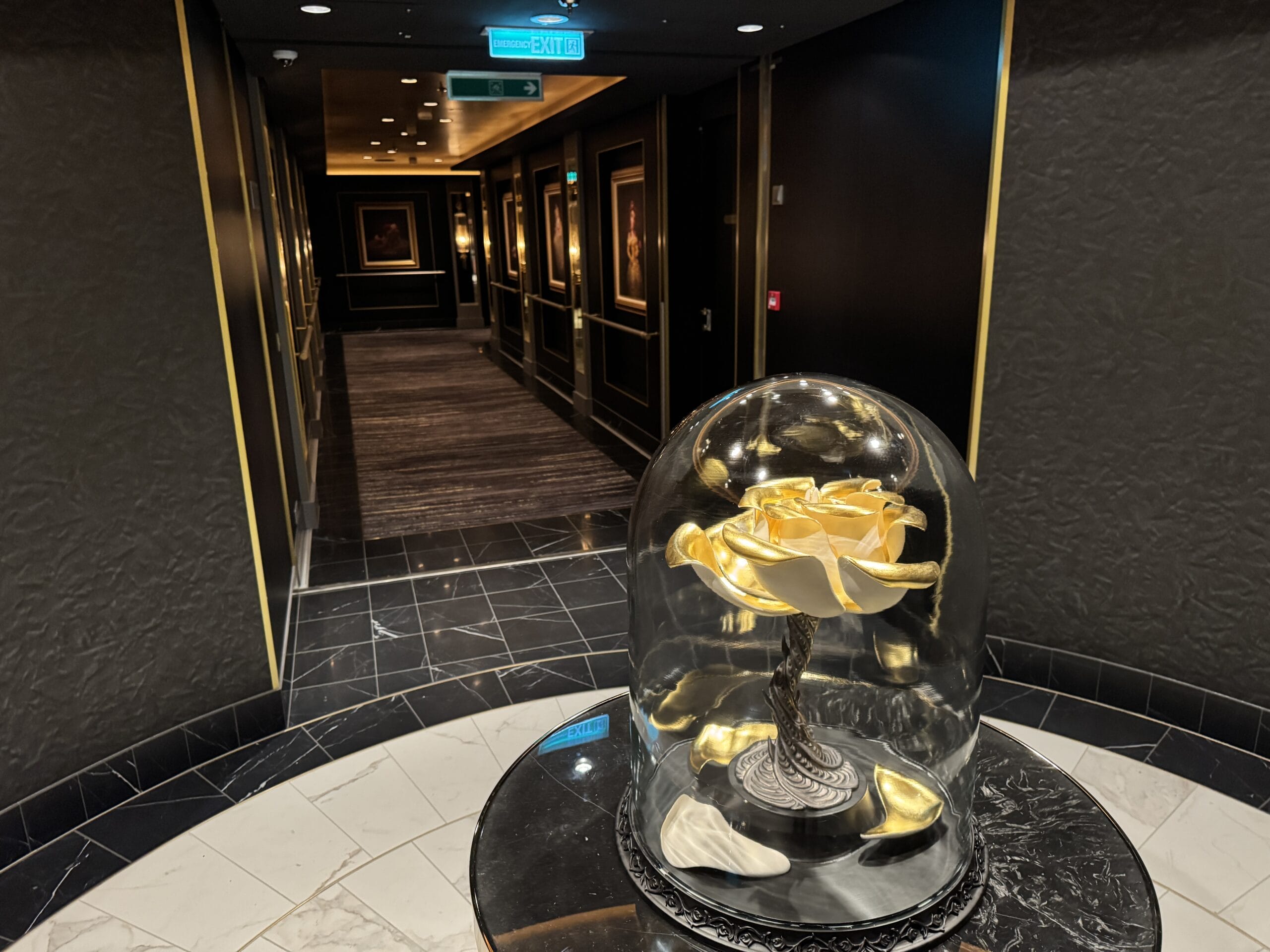 A rotunda at the end of the hallway has a black marble-top table with a rose sculpture under a glass cloche.