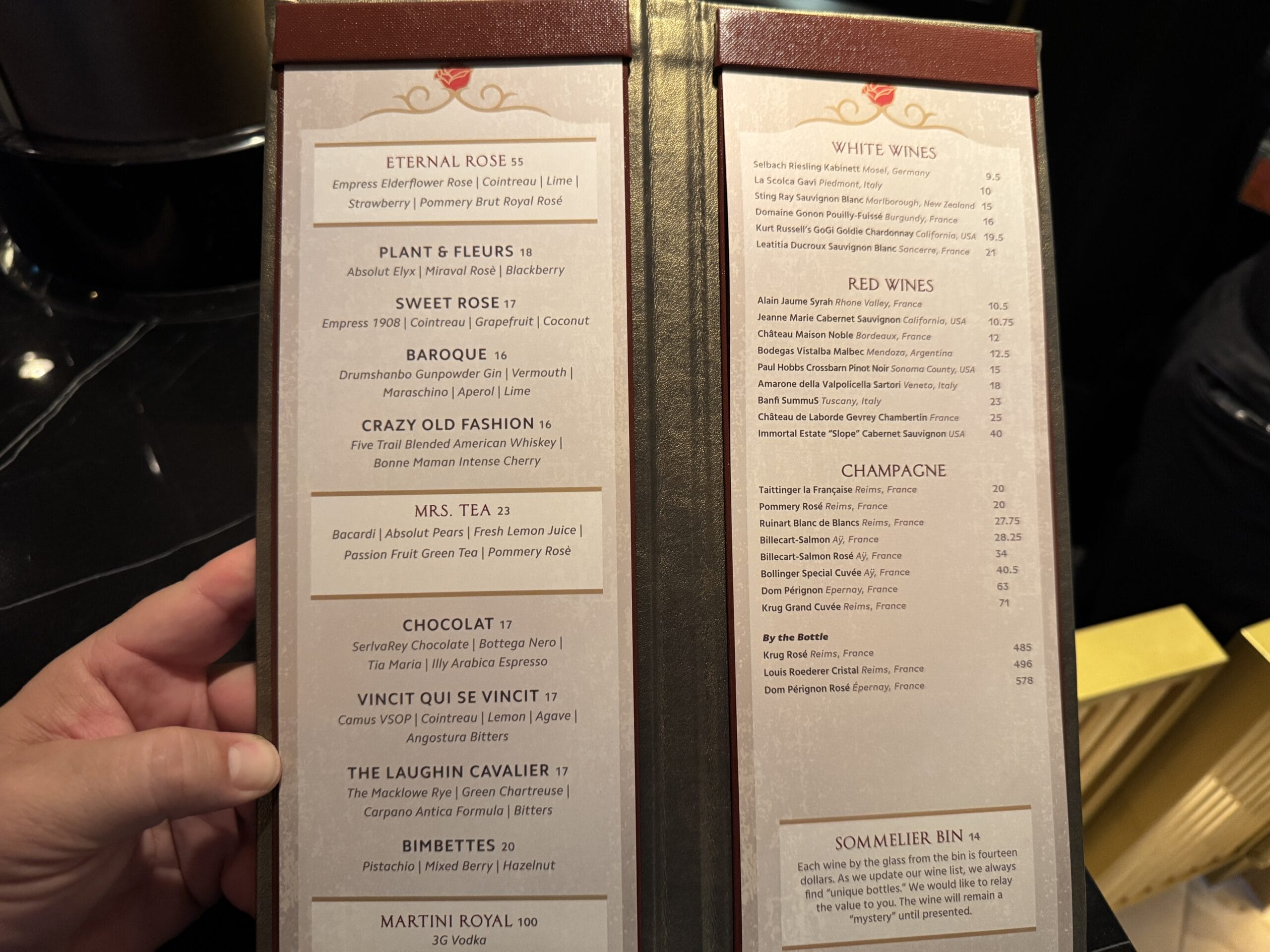 The Rose serves a selection of high-end wines and liquors, as well as a special menu of gourmet amuse-bouche and small plates. The menu includes the following: