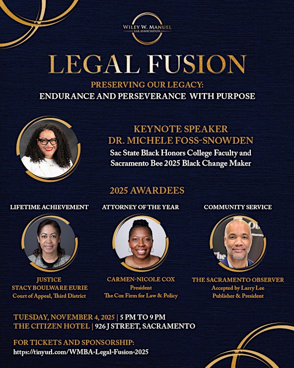 - Legal Fusion 5-9 p.m. Tuesday, Nov. 4, at the Citizen Hotel, Autograph Collection. Join the Wiley W. Manuel Bar Association at the Citizen Hotel for our annual gala celebrating legal excellence and awarding scholarships to local law students. The keynote speaker is Dr. Michele Foss-Snowden. 2025 awardees include Justice Stacey Boulware Eurie, Court of Appeal, Third District, for the lifetime achievement award; Carmen-Nicole Cox, president of the Cox Law Firm for Law and Policy, for attorney of the year; and Larry Lee, president and publisher of The OBSERVER, for community service. Tickets from $50.
