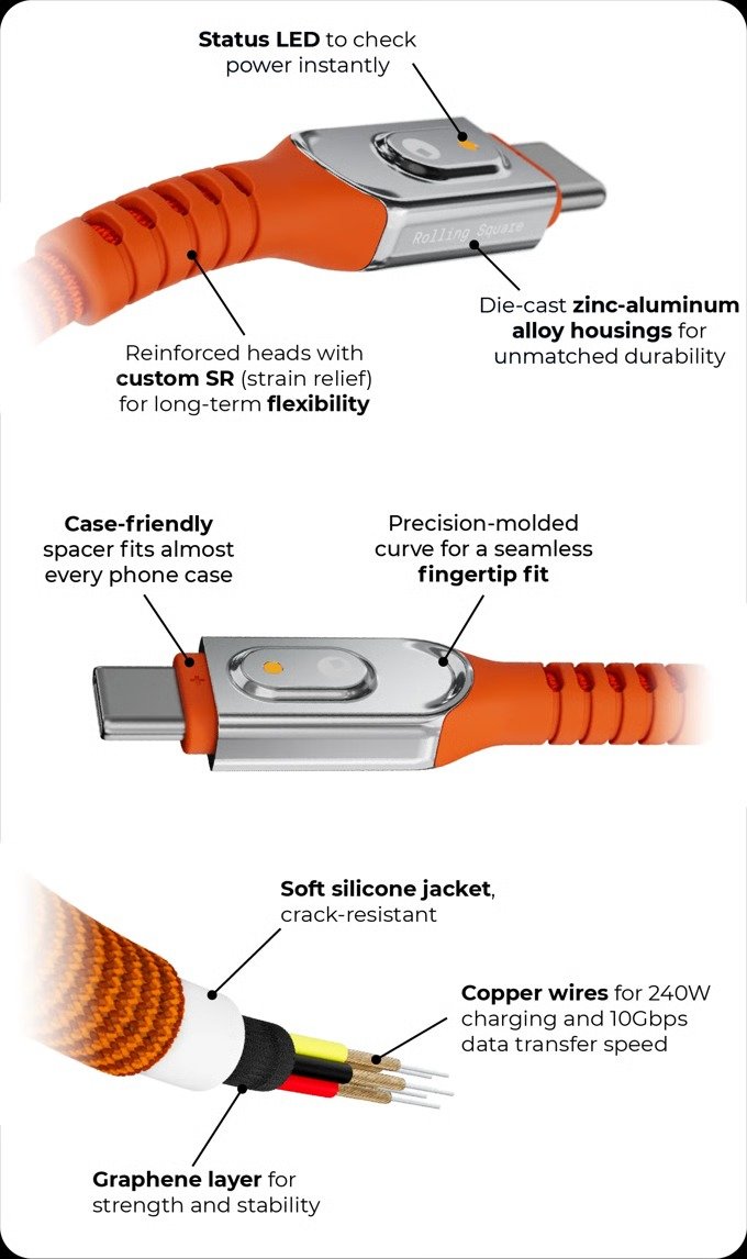 The cables are said to be extremely durable, being reinforced with graphene, jacketed in silicone and sleeved in nylon braiding. The company guarantees them for life, offering free replacements upon proof of destruction. (You have to send them a video of you snipping your theoretically-failed cable in half.)