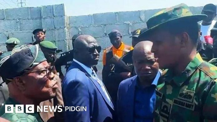 One of di milliary officers wey dey follow Wike tok make am clear say dem get document for di land, and dem get am legally, but di minister disagree.
